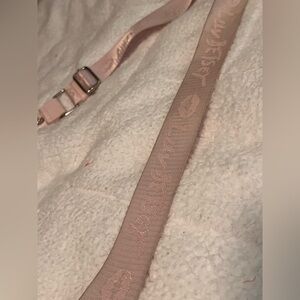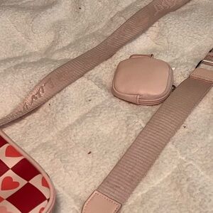 Stylish pink checker crossbody with heart accents. Soft blush-pink color adds a feminine touch. Adjustable branded strap for comfortable wear. Multiple heart details create a playful, romantic look.