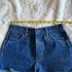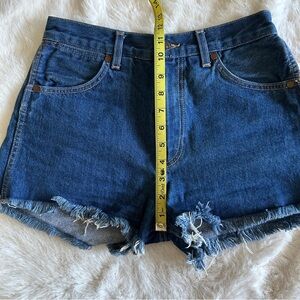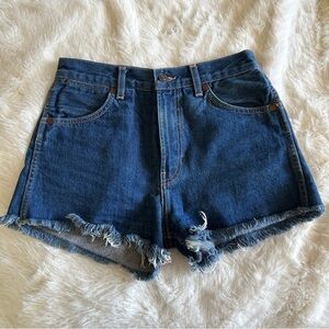 Redone denim shorts, frayed hem, dark wash, size 26.