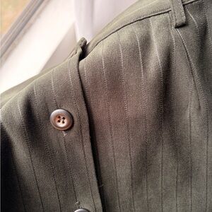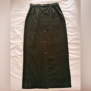Classic dark green skirt with subtle pinstripes. Button-front detail down the center. Tailored, versatile piece for work or dressy looks.
