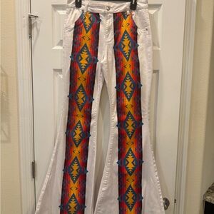 Ranch Dress'n white flare jeans featuring a bold multicolor Aztec stripe and pocket accent. Soft, versatile white denim with vibrant red, orange, teal and blue geometric detailing. Clean, stylish flare silhouette for everyday wear. Eye-catching accent adds a modern, Southwestern touch. These are sooooo stinking cute and comfy/stretchy fit is the best. Definitely eye catching! Nonsmoking home.