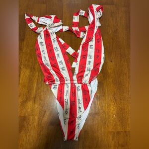 Bright yellow mini dress by For Love And Lemons. Puff sleeves and a subtle keyhole front. Ruched skirt with a draped front tie. Floral jacquard texture throughout. Feminine and eye-catching.
