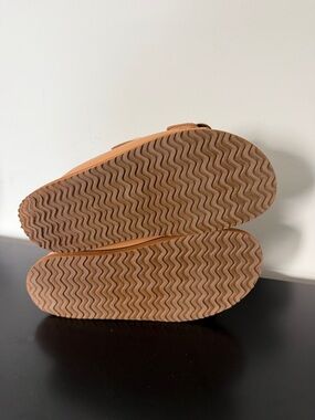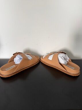 Slip-on slides in tan leather. Two oversized gold-tone buckles. Padded footbed for comfort. Stitched sole detail for style.