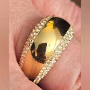 Authentic Swarovski wide dome statement ring featuring a mirror-polished gold-tone center band framed by rows of brilliant Swarovski pave crystals. A bold, glamorous piece that delivers serious sparkle and comfort.
