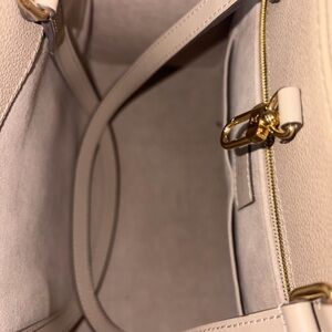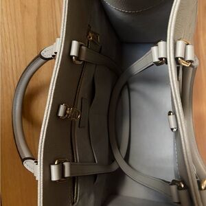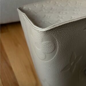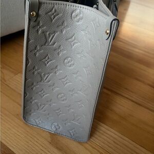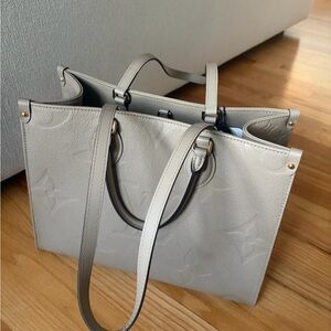 Chic Louis Vuitton tote in light gray. Features iconic monogram design. Perfect for everyday elegance.