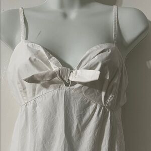 Chic white dress with a bow accent. Features tiered design and adjustable straps.