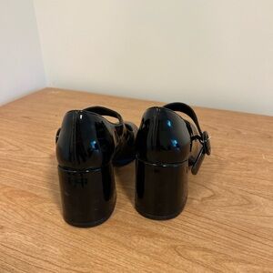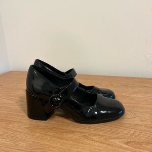 Shiny patent Mary Jane pumps with a secure strap. Chunky block heel for stable wear. Round buckle adds a retro touch. Sleek silhouette for day or night.