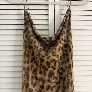 Sleek maxi slip dress with classic leopard print. Cowl neckline and thin straps. Flowy silhouette for easy movement. Versatile piece for day or night styling.