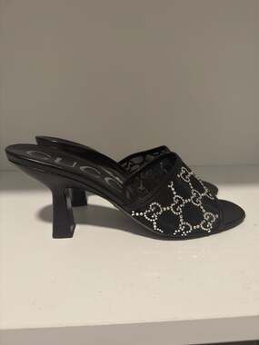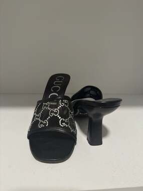 Gucci GG Mid-Heel Slide Sandals Mules in Black, size 37 (US 7). These elegant sandals feature a black mesh strap adorned with sparkling rhinestone crystals in the iconic GG monogram pattern.