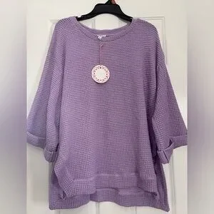 Cozy waffle knit texture. Relaxed fit with rolled sleeves. Perfect for casual wear.