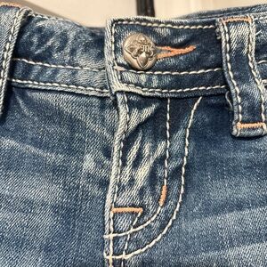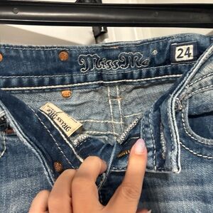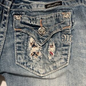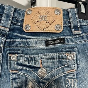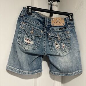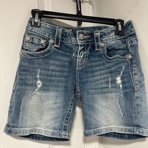 Stylish Miss Me denim shorts with light distressing. Classic five-pocket design with contrast stitching. Comfortable casual look for warm days. Blue color shown.