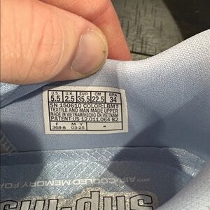 Light pastel blue knit upper with pink trim. Slip-on design with elastic lacing. Cushioned midsole for comfort. Breathable athletic styling for everyday wear.