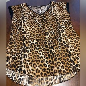 Eye-catching leopard print camisole by Express. V-neck silhouette with sleeveless cut. Soft, flowy fabric with curved hem. Classic brown and black animal pattern for versatile styling.