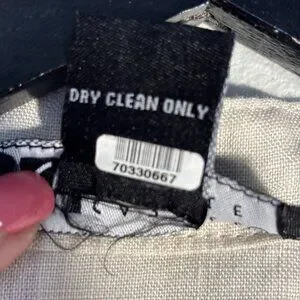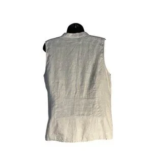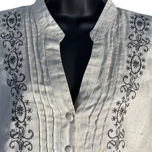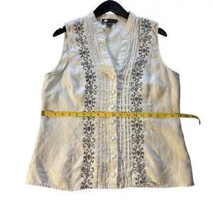 This sleeveless blouse from Carole Little combines elegance and comfort with its breathable linen fabric. Featuring intricate black embroidery on a beige background, it has a button-front closure and a mandarin collar that adds a polished touch. Ideal for warm weather, this blouse ensures both sophistication and ease of wear. Great layering piece,