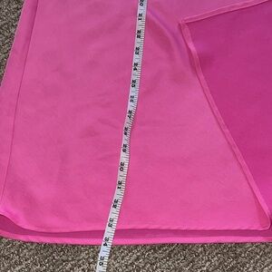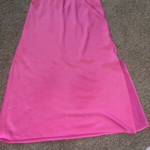 Bold bright pink maxi skirt. Smooth fabric with clean lines. Straight silhouette with a subtle side slit. Easy-to-style piece for casual or dressy looks.