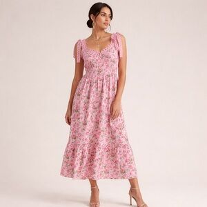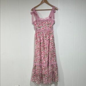 Blu Pepper Pink Floral Midi Dress Cottagecore Lace Trim Feminine Romantic Summer M