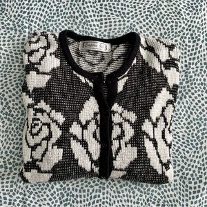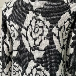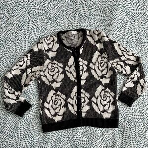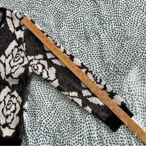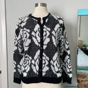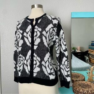 Empire Cat Black & White Floral Rose Knit Cardigan Sweater Medium Button Down