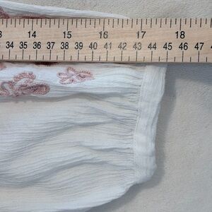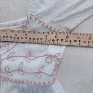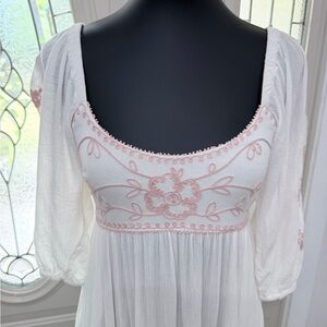Beautiful Free People maxi dress in a soft ivory white Featuring delicate blush pink embroidery across the bust and sleeves for a romantic, boho feel.