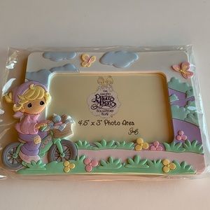 New, never used Precious Moments Vinyl Photo Frame - image is of a girl on a bicycle in spring. 4.5” x 3” photo area. Frame itself is about 7” l x 5” h. Comes from a smoke- and pet-free home.