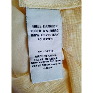 This is a pre-owned ZAC & RACHEL women's blouse in a light yellow color, size L. The blouse features ruffled short sleeves and a keyhole cutout at the neckline with pintuck detailing on the front. The fabric has a textured, dotted pattern throughout. The care tag indicates the shell and lining are 100% polyester and it was made in China. The garment appears to be in good condition with no visible imperfections.