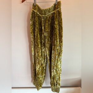 Soft crushed velvet fabric. Elastic smocked waistband and cuffs. Relaxed, tapered leg. Rich olive green tones with subtle sheen. Easy to style for casual or dressy looks.