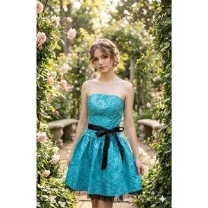Make a statement at your next formal event with this stunning Jessica McClintock for Gunne Sax strapless mini dress. This piece features a vibrant teal floral damask fabric with a sophisticated sheen, perfect for catching the light on the dance floor. The classic fit-and-flare silhouette is accented by a bold black satin waist sash and a feminine "peek-a-boo" black tulle hem for added volume and vintage flair. Original sash has been replaced by a black grosgrain ribbon sash. Color is closest to aqua on the mannequin.