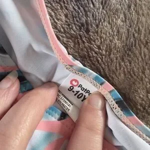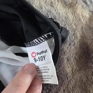 PatPat branded kids swim top in solid black. Soft stretch fabric with elastic edge. Simple, versatile design for swim and play. in great shape, the only one that has some issues is the leafy one.It has a little wind stuff in the back of the butt that you can see on the photo other than that.There's nothing wrong with it
