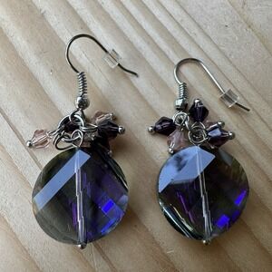 Hook Earrings 1.75 Inch Purple Blue Iridescent Faceted Beads Glass Silver Tone