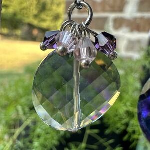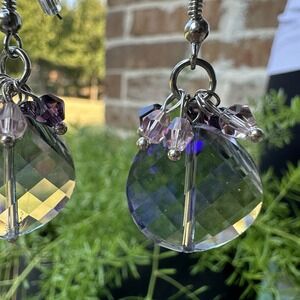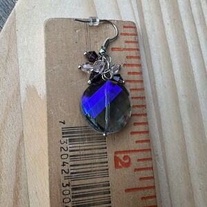 These hook earrings feature 1.75 inch purple and blue iridescent faceted crystal glass beads with a silver tone metal finish. The earrings are artisan crafted and hand-made, making them a unique and stylish accessory for various occasions such as engagements, weddings, anniversaries, birthdays, and more. The beaded and dangle/drop style adds a touch of beauty and fantasy to any outfit, perfect for those who appreciate art, bohemian, and celestial themes in their jewelry collection. Ideal for those looking for a pop of color and sophistication in their ensemble. These hook dangle earrings are in good pre owned clean condition with minor use wear, all original crystals in good shape. Please review the pictures for details and size measurement information, thank you.