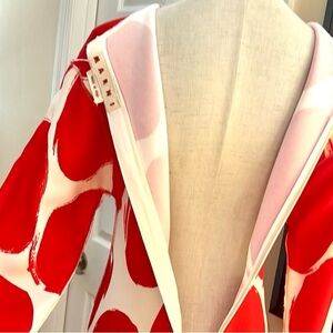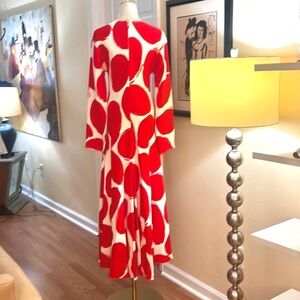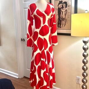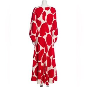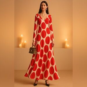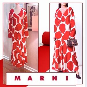 Marni,β¦is an Italian luxury fashion house founded in 1994 by Consuelo Castiglioni in Milan, Italy. Exquisite Lux Statement Dress, Striking Marni designer midi dress featuring bold red and ivory polka dots on luxe Italian cady stretch fabric. Effortlessly elegant with a fluid A-line silhouette, V-neckline, and long sculptural sleeves that move with modern grace.