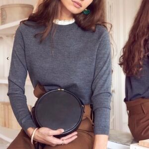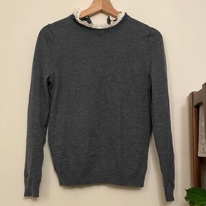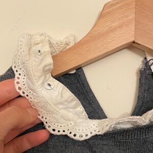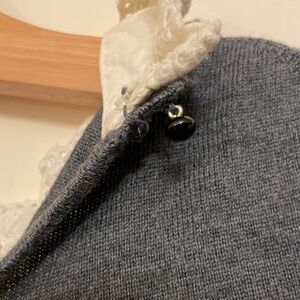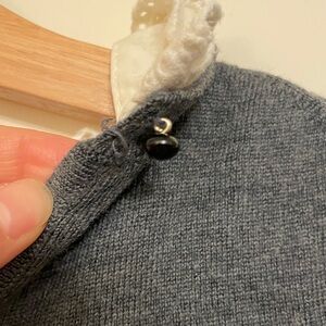 Gently worn and has been taken very good care of. Merino wool sweater with detachable lace cotton collar (see buttons). Hand-washable.