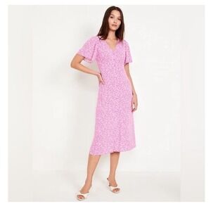 A charming pink floral midi dress from Old Navy, perfect for adding a touch of feminine flair to your wardrobe. This dress features a delightful all-over floral pattern in shades of pink and white. The dress has a flattering square neckline with a smocked bodice and short puff sleeves, creating a comfortable yet stylish silhouette. The midi length and subtle front slit make it versatile for various occasions, while the button front adds a vintage-inspired detail. Pair it with sandals for a picnic in the park, dress it up with heels for a garden party, or wear it on a casual date night for an effortlessly chic look.