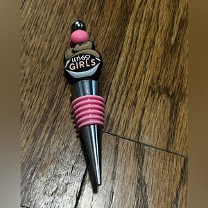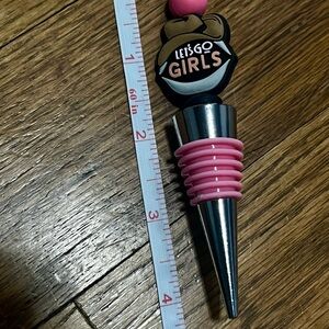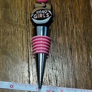 Novelty wine bottle stopper with pink silicone rings. Decorative top reads "LET'S GO GIRLS". Metal tapered stopper for a secure fit. Cute and fun bar accessory.