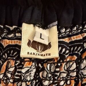Banjamath harem pants in size L featuring a captivating peacock feather print on a dark background with a flattering smocked waistband. These pants offer a unique bohemian aesthetic perfect for casual outings, yoga sessions, or relaxing at home.