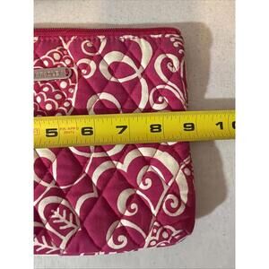 The Vera Bradley Makeup Bag in Pink Twirly Birds is a stylish and functional accessory for women on-the-go. Featuring a zip closure, this rectangular shaped bag is perfect for travel or casual outings. Made from cotton with a quilted finish, the exterior showcases a playful pink twirly birds pattern while the lining is crisp white. The bag's compact size of 9 inches in width and 6.5 inches in height makes it convenient to carry in your purse or backpack. Perfect for storing makeup or other small items, this versatile clutch is both practical and chic.