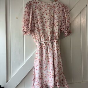 Chic mini dress with a V-neck. Features a floral pattern and puff sleeves. Ideal for casual outings. Please note that the model is AI generated and is there to show how the item can be worn. Please check photos for exact details of dress.
