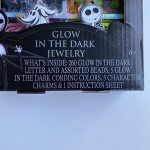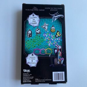 This is a Glow in The Dark Jewelry Set from Disney's The Nightmare Before Christmas. The set is brand new and made in China. It is perfect for fans of the movie and those who love to create their own jewelry. The set includes everything needed to make a unique and colorful necklace and bracelet. The glow in the dark feature adds a special touch to the pieces, making them perfect for wearing at night or displaying in a window.