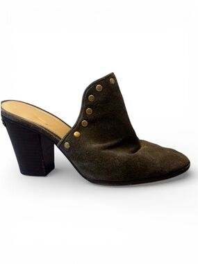 MICHAEL KORS Louise Suede Mules in olive green with gold studs | Size 9.5