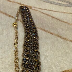 Elegant choker featuring dark brown beaded floral links with gold chain accents. Lightweight and refined for everyday or special occasions. Adjustable gold chain ensures a comfortable fit. Adds polished, feminine sparkle to any outfit.
