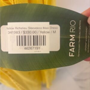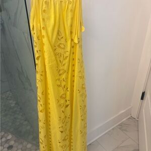 Sunny yellow maxi dress with delicate eyelet details. Flowing silhouette and button-front style. Soft, lightweight fabric ideal for warm weather.