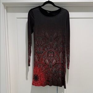A Desigual sleek long-sleeve dress featuring a red paisley and floral pattern. Soft, stretchy fabric offers comfortable all-day wear. Flattering A-line silhouette with a round neckline. The red patterned design adds bold, feminine style.