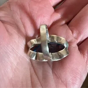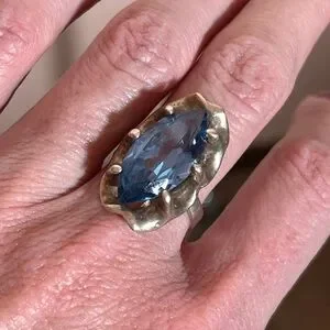 Stunning Art Deco ring from the 1920's with a brilliant sky blue topaz in a marquee cut. Unique brutalist styled sterling silver metal with a ruffled edge with claw like prongs that hold the large stone in place. wonderful contrast between the sparkling clear stone and the patinated silver. Oversized ring that makes a statement. tested for sterling silver and blue stone turns a bright pink in a black light and tested.