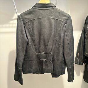 Genuine leather moto-style jacket. Asymmetric zip and zippered pockets. Snap collar and seam detailing. Sleek black finish.