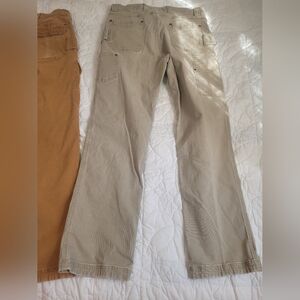 Lot of two Duluth Trading Co. flex fire hose pants. Tags say 34×34, but they measure shorter. See pictures for measurements. One pair has cargo pockets, and both are relaxed fit. In good pre-owned condition with light all over wear, and some wear on the hems.