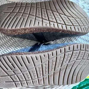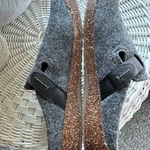 Comfortable felt upper for relaxed wear. Elasticized straps for easy on and secure fit. Cushioned footbed for light support. Neutral grey pairs with casual outfits.