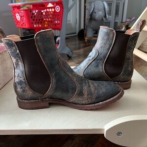 Slip-on Chelsea boots. Distressed leather upper with rugged character. Elastic side panels for easy wear. Pull tabs at the heel for removal. Sturdy rubber outsole for grip.