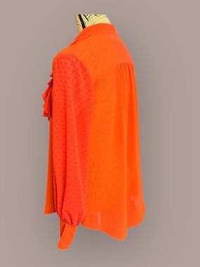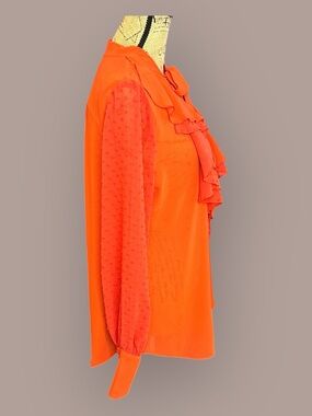 This exquisite blouse showcases a signature ruffled jabot collar, a delightful bow necktie, and sheer sleeves adorned with a "dobby" pattern, finished with elasticized cuffs.