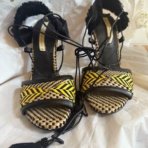 Stylish sandals with intricate black and yellow weave. Lace up with Tassel details at the ends for added flair.