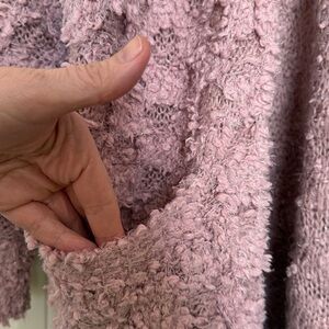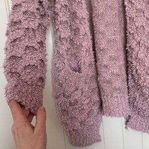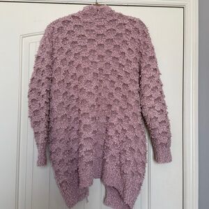 Dusty pink open-front cardigan with textured knit. Features front pockets and a relaxed drape. Plush, cozy feel for layering. Versatile casual piece.