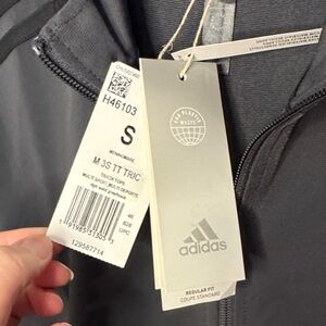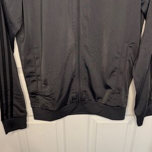 Classic dark gray and black track jacket with Adidas logo and classic three stripes down each arm. Lightweight and versatile. Ideal for casual wear. Fabric is 100% polyester.