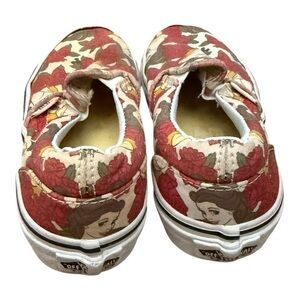 Vans slip-on shoes featuring Disney princess Belle design with red roses. Comfortable and stylish.